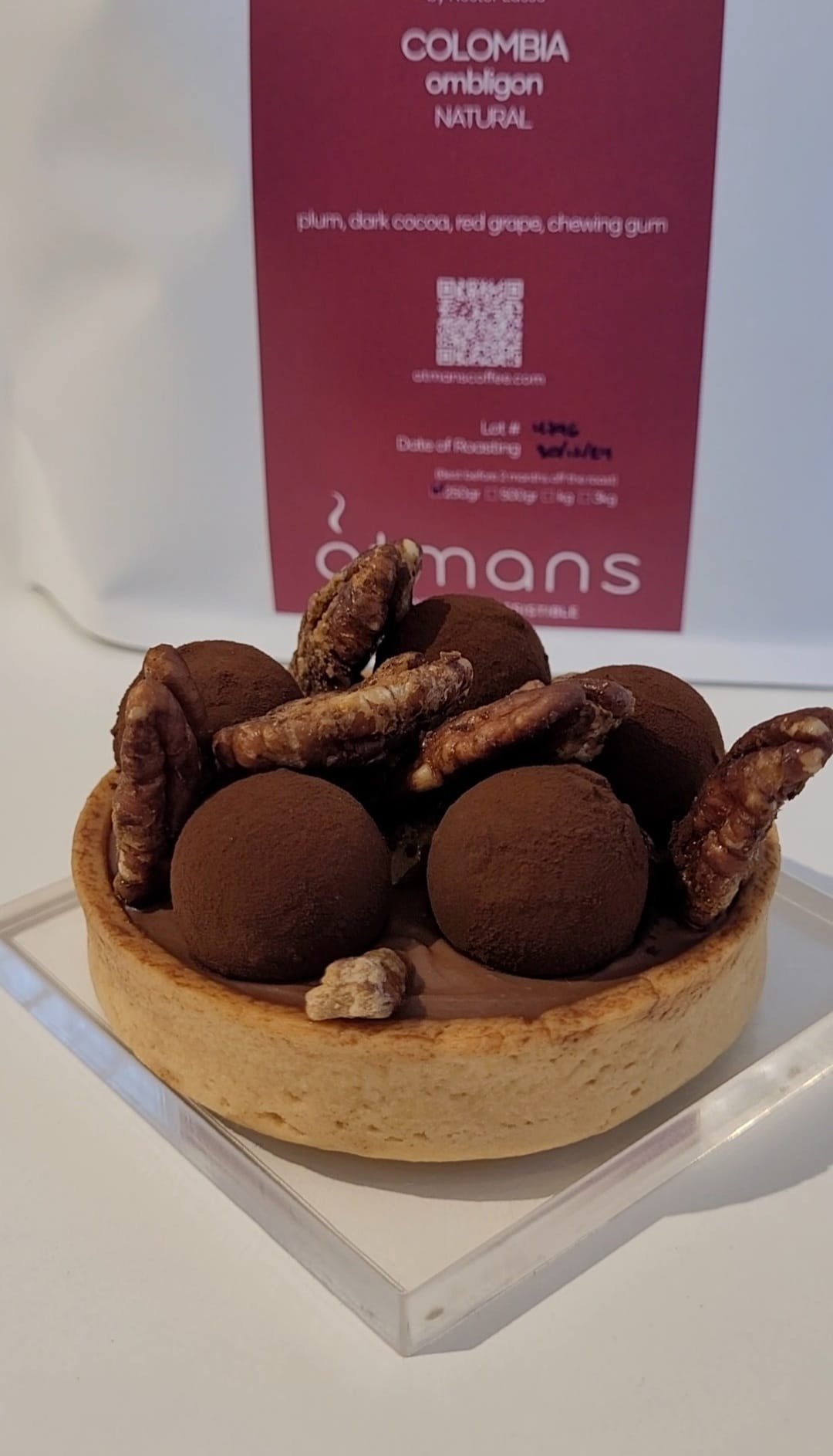 Tartaleta rellena de ganache de chocolate satilia 62% cacao, nueces pecanas garrapiñadas en azucar de coco y trufas ligeras de chocolate.