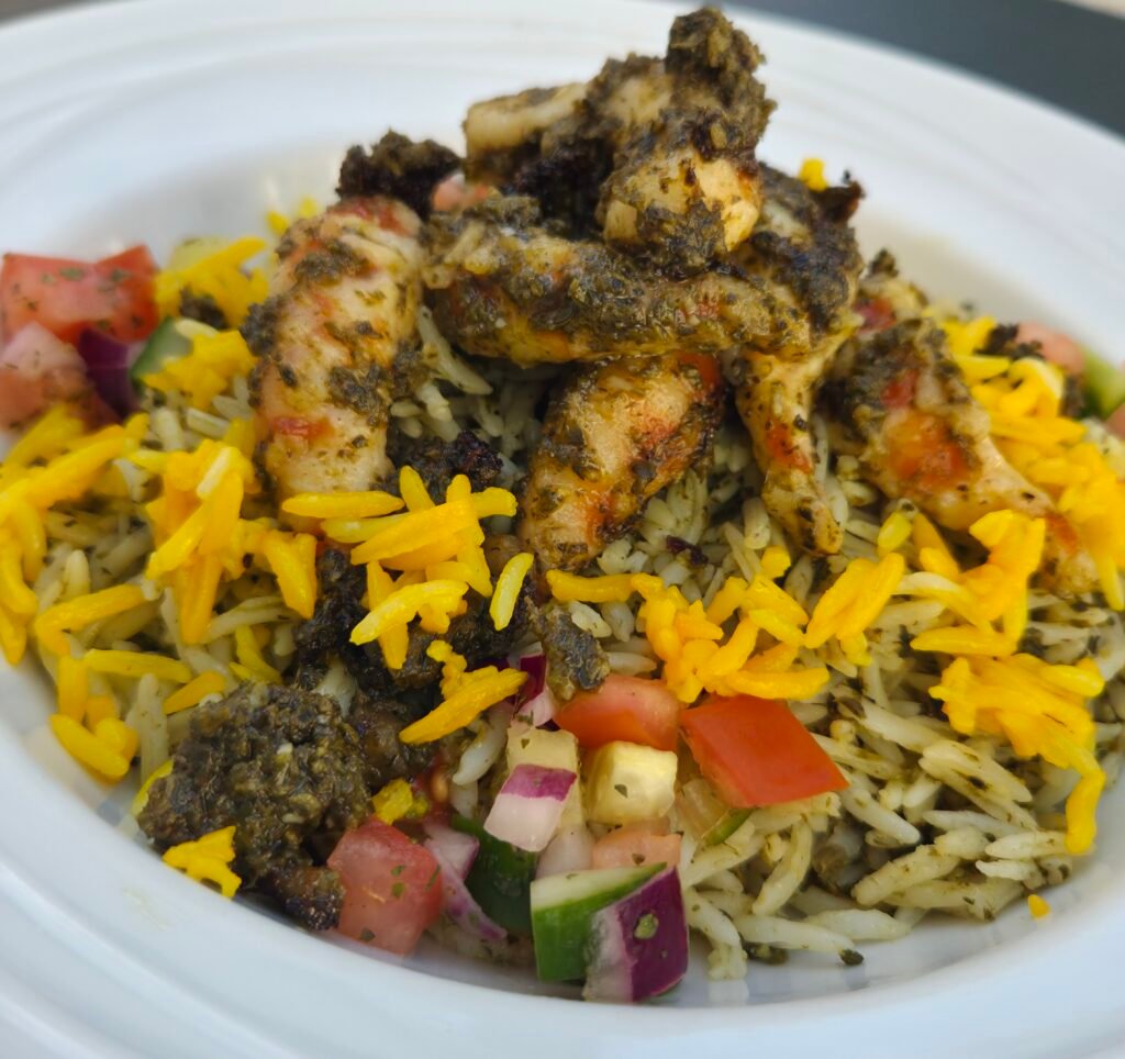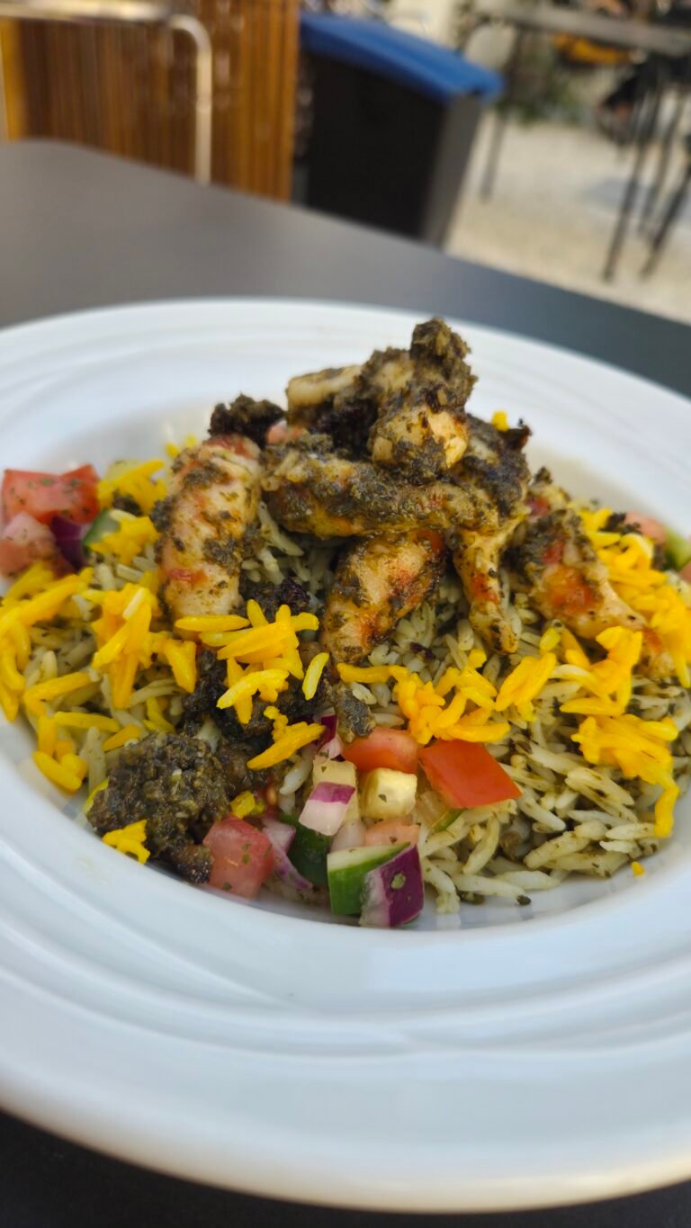 Arroz con hierbas y “vegambas” (Meygoo Polo): un pilaf aromático con hierbas persas, “gambas” veganas marinadas en ajo y salsa de tamarindo-hierbas (versión vegetal de una receta tradicional del sur iraní).